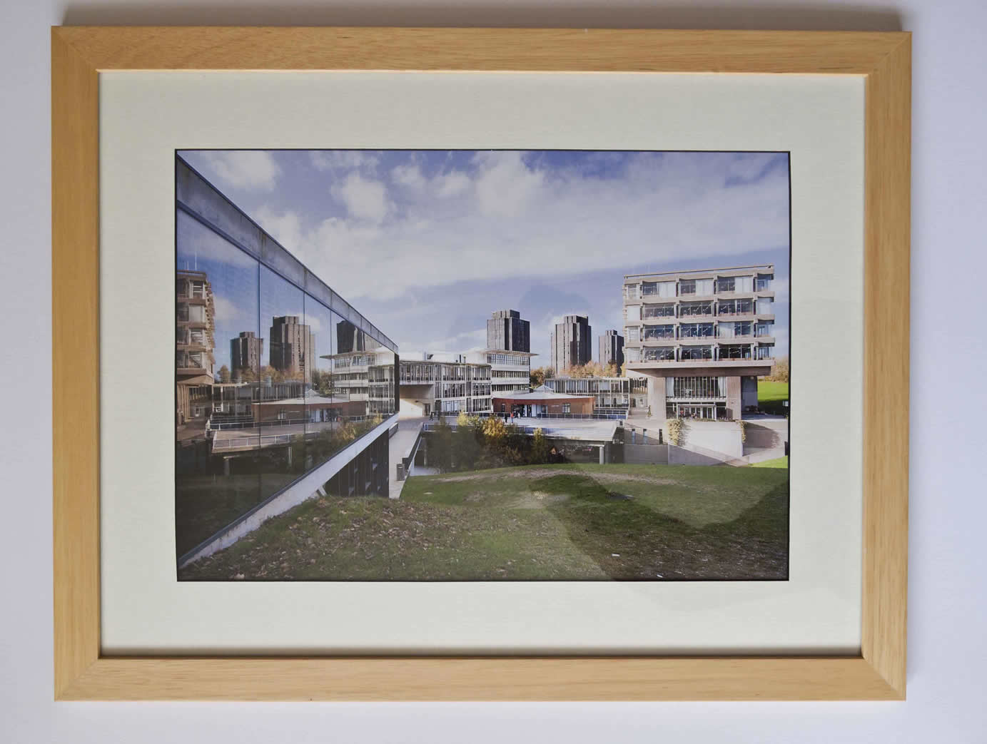 The frames shown in the photographs below consist of high quality beech or a narrow black matt wood and have proved very popular. The cut-out white mount has a bevelled black edging.